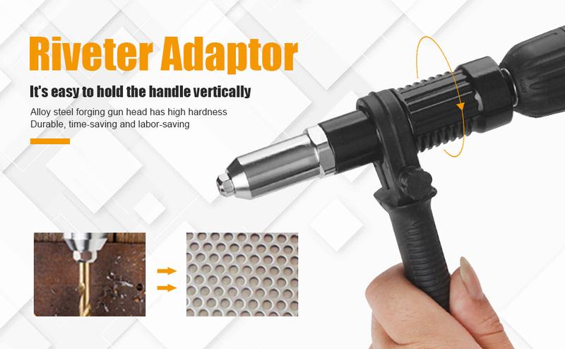 Easy to use:·Adjust the drill to the proper gear.·Open the drill clamp, insert the adapter, turn it forward and clamp the connector.·Turn on the reverse rotation function of the drill until you hear the sound of "DADADA", then insert the proper size rivet.·Turn on the forward rotation function, align the hole and insert the rivet.·Turn on the reverse rotation function and exit the rivet.